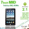 Private Models!!! 7 InchTelechips 8902,800MHz Android 2.1 OSMID Specification: Model No: G07-TC CPU: Telechips 8902, 800MHz OS: Android 2.1 Display: 7.0 Inch TFT Resistive Touchscreen,800 x 480 Pixels Memory: 256MB NandFlash: 2GB built-in, can extended upto 16GB by TF Card or Micro SD Android Market: Download and install any compatible application from the Official Google Android Market. The number of available apps is approaching 10,000 ! 3G: Support 3G USB Dongle Wireless: WI-FI (802.11 a/b/g) Game: 3D Game Sensors: G-sensor(Built-in Accelerometer),Automatic screen rotation from landscape mode to portrait and vice versaI/O Port: 1X Standard Micro USB Port 1X 3.5MM Stereo Headphone Jack 1X HDMI 1X MicroSD Card Dock 1X Mini USB PortSound System: Built-in speaker Audio Player: Audio formats supported: MP3,WMA,AAC,OGG Video Player: Video formats supported: 1080P, MP4, AVI, WMV, DIVX, Flash,3GP,RMVB4 Mail attachment: Viewable document types: jpg,bmp,png,gif,txt,pdf,xls,doc,zip Built-in Google viewer & photo editor Supports third party software via the Official Google Android Market Battery Time: WIFI ON: 4 hours;WIFI OFF: 6.5Hours Language: Support Multi-Language Accessory: 1 X 7.0 Inch Android Tablet PC 1 X Touchscreen stylus 1 X Power Adapter 1 X USB Cable 1 X User Manual Product Size: 195 x 117 x 14MM , 300G Package Size: 250 x 180 x 80 MM, 1.1KG